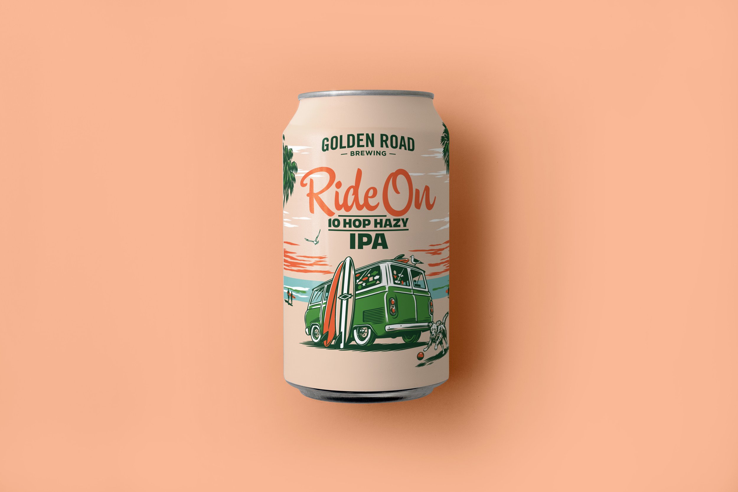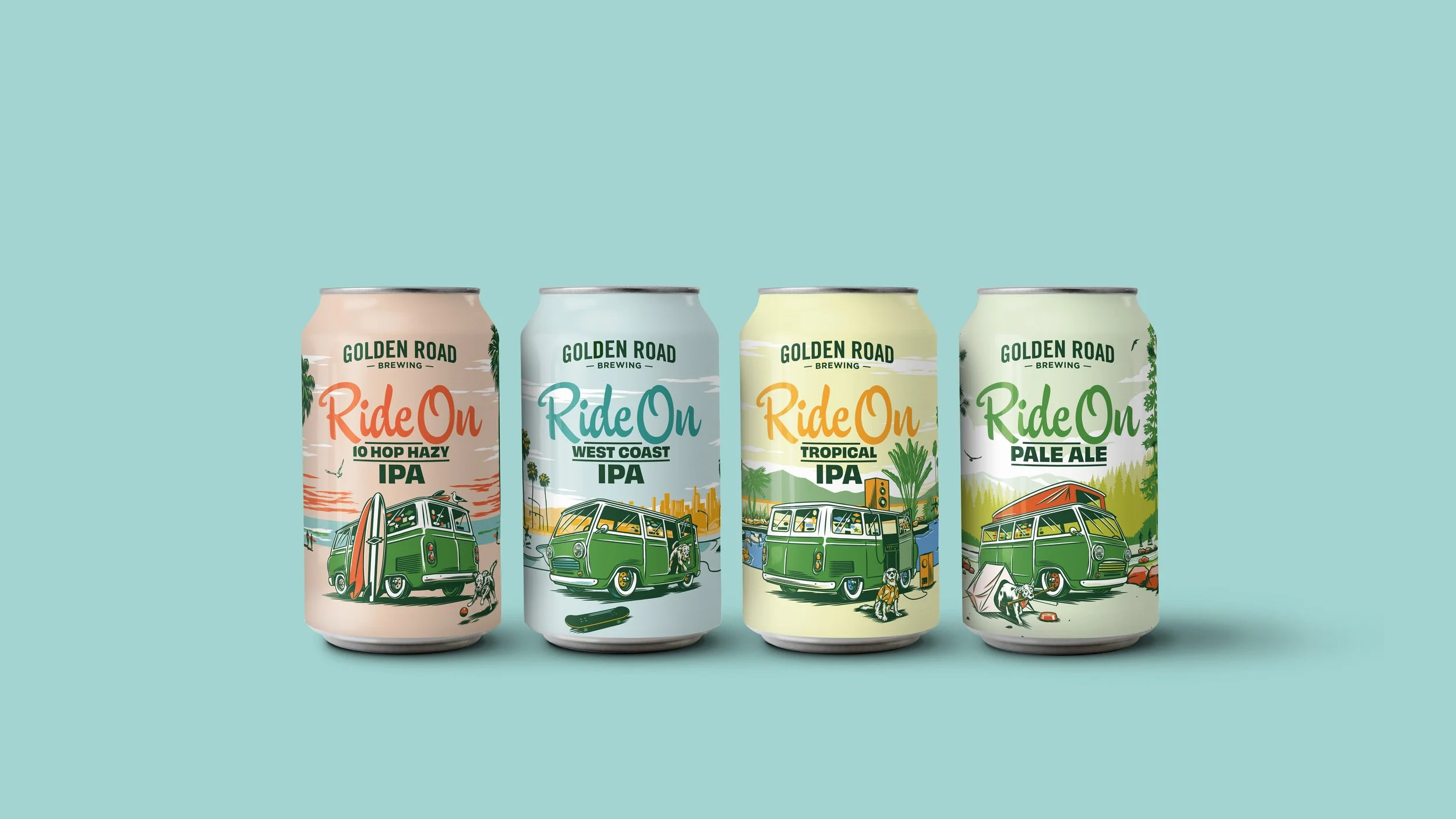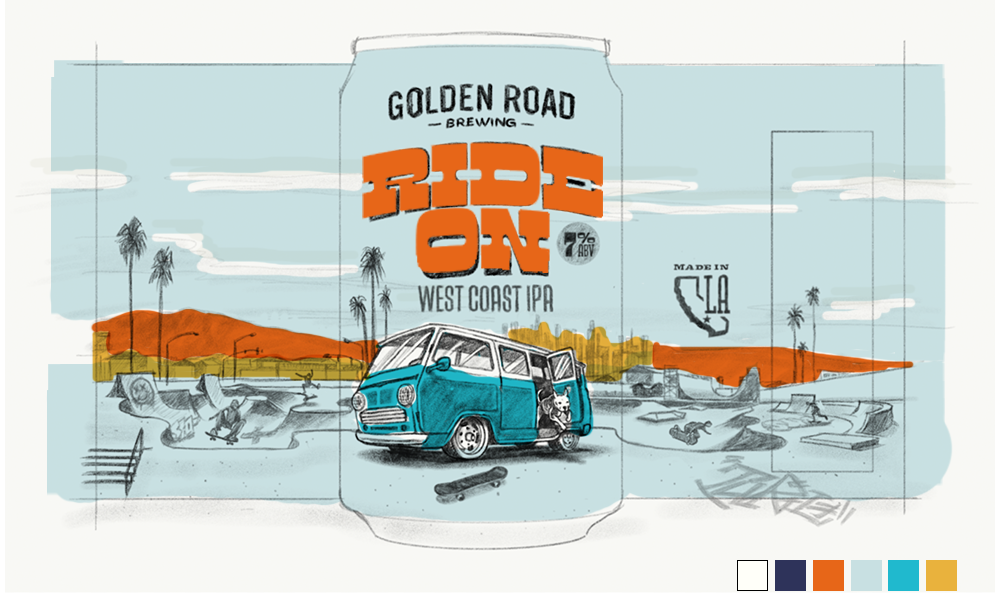 We were asked to help relaunch Golden Road Brewing’s “Ride On” line of beers, encompassing the Los Angeles spirit while highlighting the van mascot. We worked with illustrator KidMarkie to create four unique SoCal adventures featuring the van and sidekick dog.